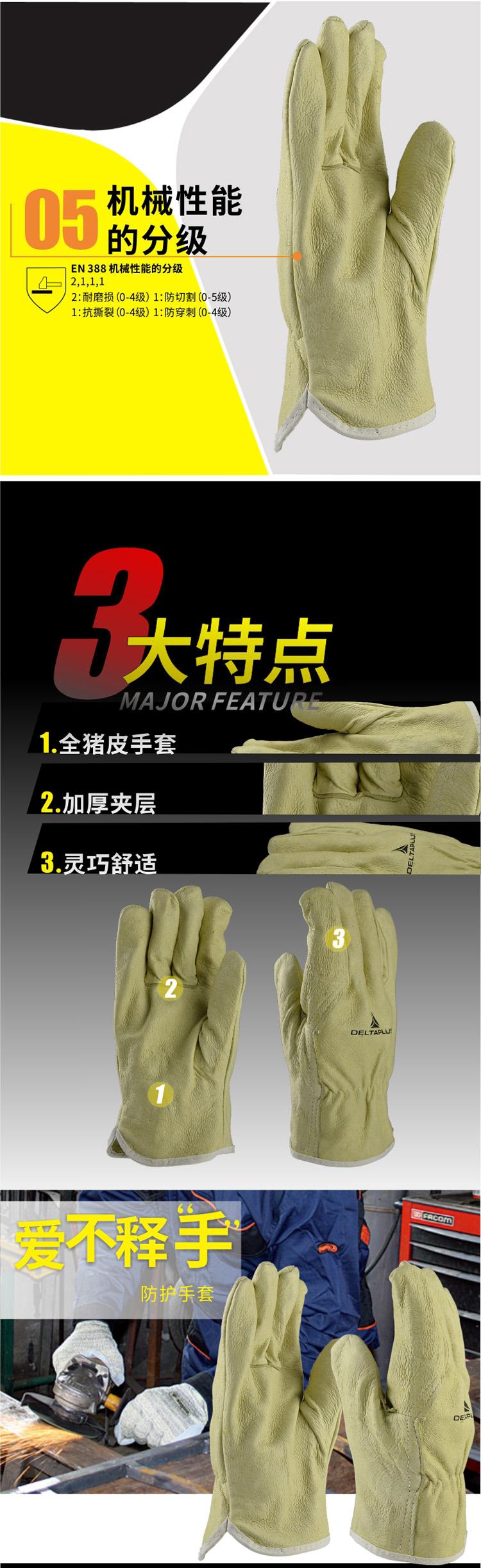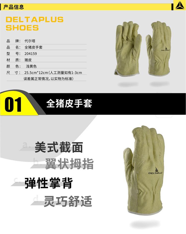 商品名稱:代爾塔 全豬皮搬運勞保手套 耐磨透氣靈巧安.全手套 機械加工修理造船204159 淺黃色9#