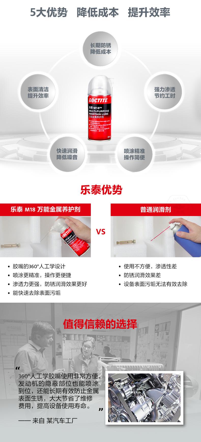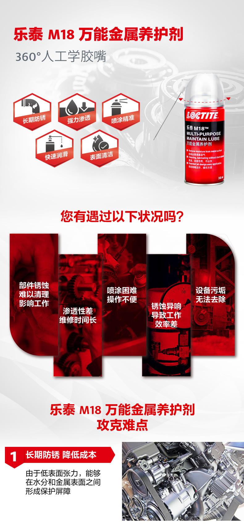 樂泰M18萬能金屬養(yǎng)護(hù)劑是一款集防銹、滲透、潤滑、清潔于一體的產(chǎn)品。樂泰M18萬能金屬養(yǎng)護(hù)劑由于低表面張力,能夠在水分和金屬表面之間形成保護(hù)屏障,實(shí)現(xiàn)長期防銹。樂泰M18萬能金屬養(yǎng)護(hù)劑可快速滲透生銹和腐蝕組件,節(jié)約工時(shí)。樂泰M18萬能金屬養(yǎng)護(hù)劑采用360°人工學(xué)膠嘴,噴涂更精準(zhǔn),操作更簡便,還可快速潤滑并降低噪音,同時(shí)去除表面較輕微污垢,提升效率。